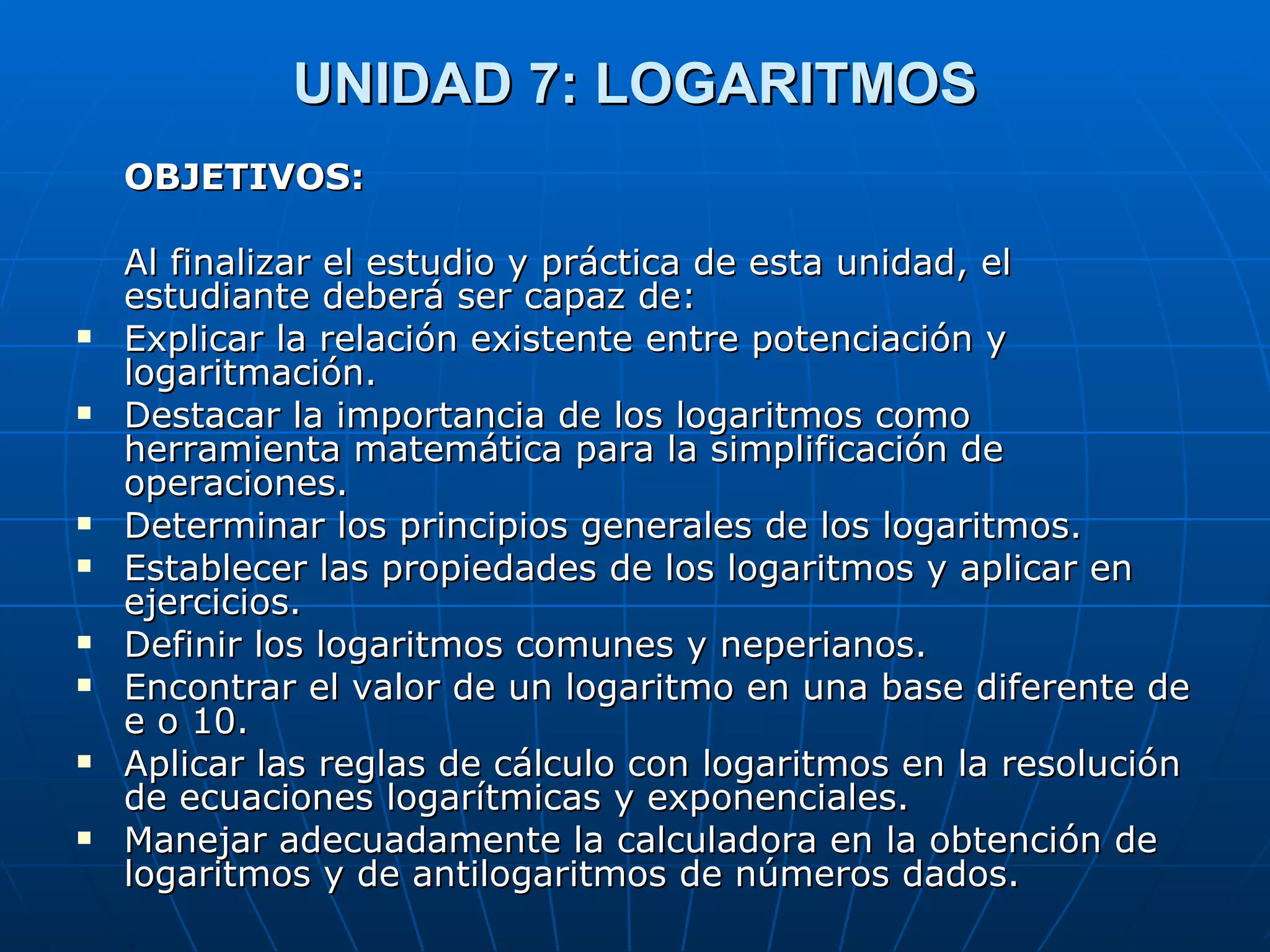Este documento presenta la unidad 7 sobre logaritmos. Introduce los objetivos de aprendizaje, que incluyen explicar la relación entre potenciación y logaritmación, aplicar propiedades de logaritmos en ejercicios, y usar logaritmos para simplificar expresiones complicadas. También define logaritmos comunes y neperianos, y explica los principios generales de los logaritmos.