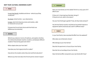 This document provides instructions and prompts for students participating in an exchange program to keep a logbook documenting their daily activities and cultural experiences in Finland. The logbook is meant to help students reflect on what they learn about themselves, their host culture, and differences from their home culture in areas like food, school, ecology, family, housing, nature, and travel. Students are asked to document their daily schedule, visits, workshop sessions, new words learned, and observations about cultural topics in Finland to compare to their home country of Poland.