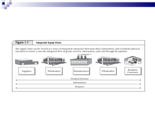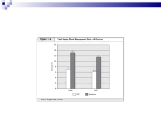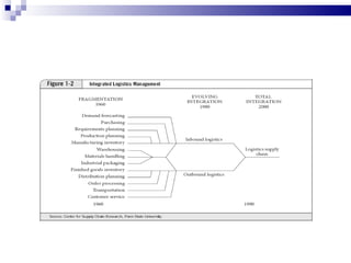 The document discusses key concepts in supply chain management. It outlines five major external forces driving change, including globalization and technology. It traces the evolution of supply chain management from physical distribution to integrated logistics management. Major issues facing supply chains are identified as networks and complexity, inventory deployment, technology challenges, transportation management, and security concerns. Efficient supply chains impact key financial metrics like cash flow, working capital, and return on investment.