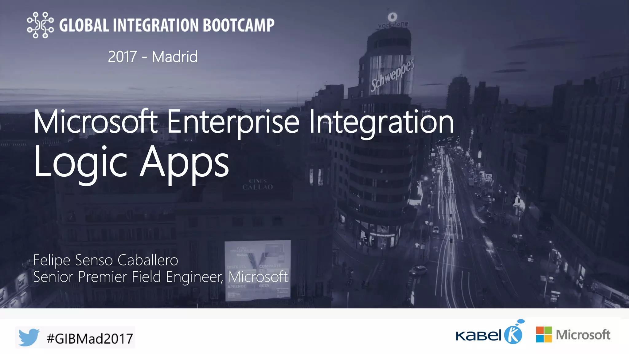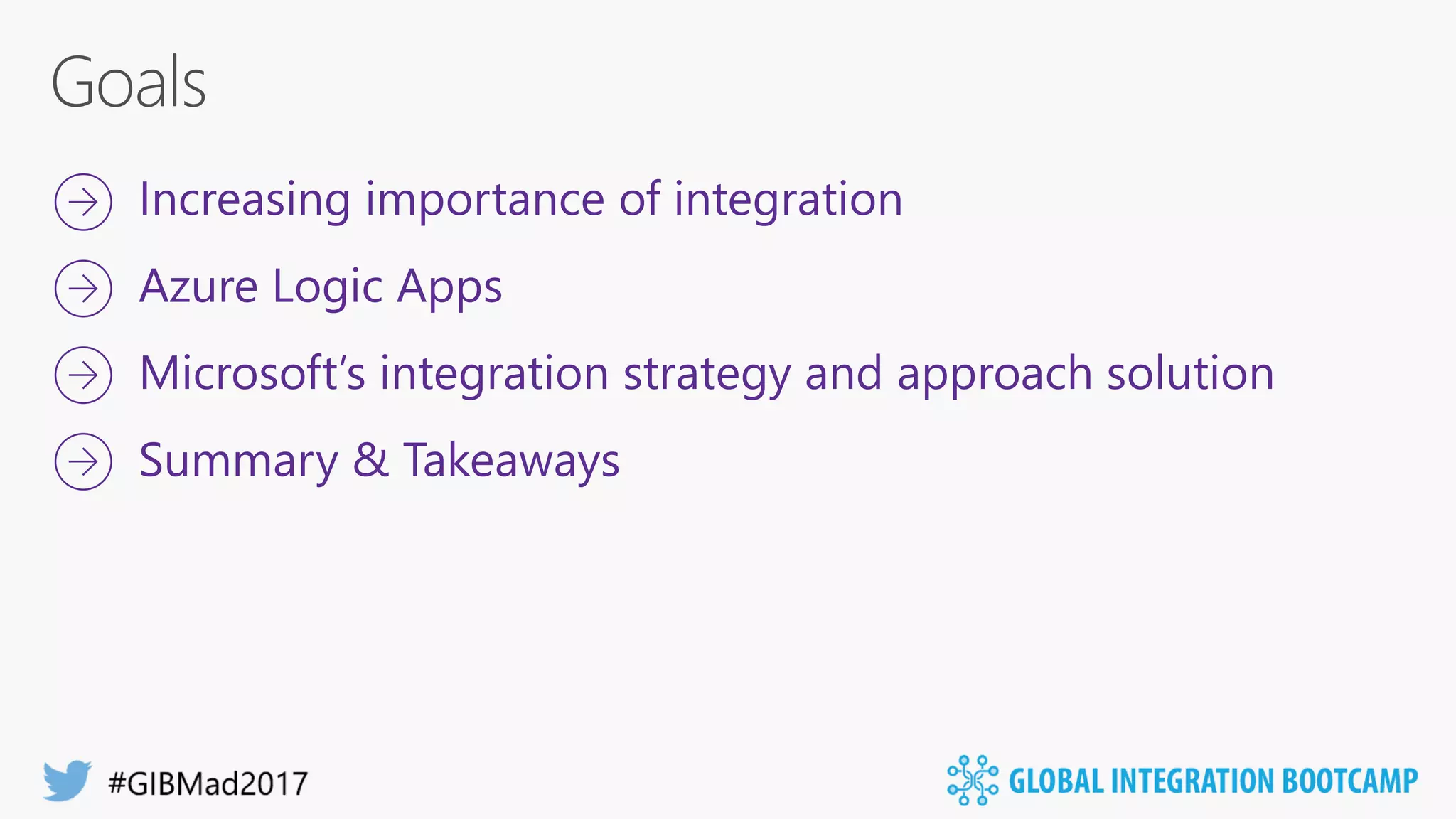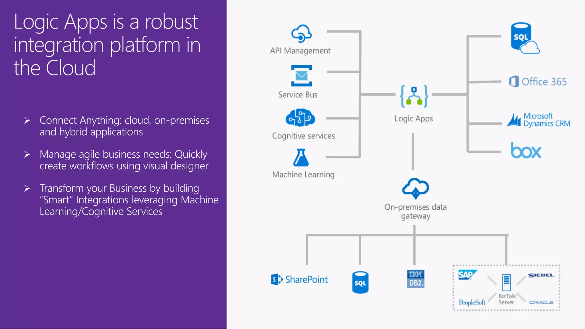 This document discusses Microsoft's Logic Apps product for enterprise integration. Logic Apps allows users to create workflows in the cloud to connect disparate applications without code using a designer. It provides templates, connections to cloud APIs and platforms, and supports protocols and formats like XML and EDI. The presenter takes questions on Logic Apps, API Management, the Enterprise Integration Pack, and BizTalk Server 2016.
