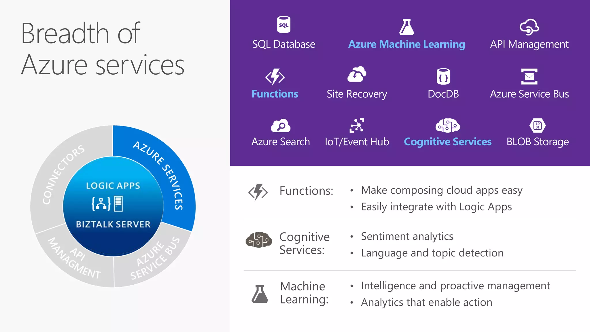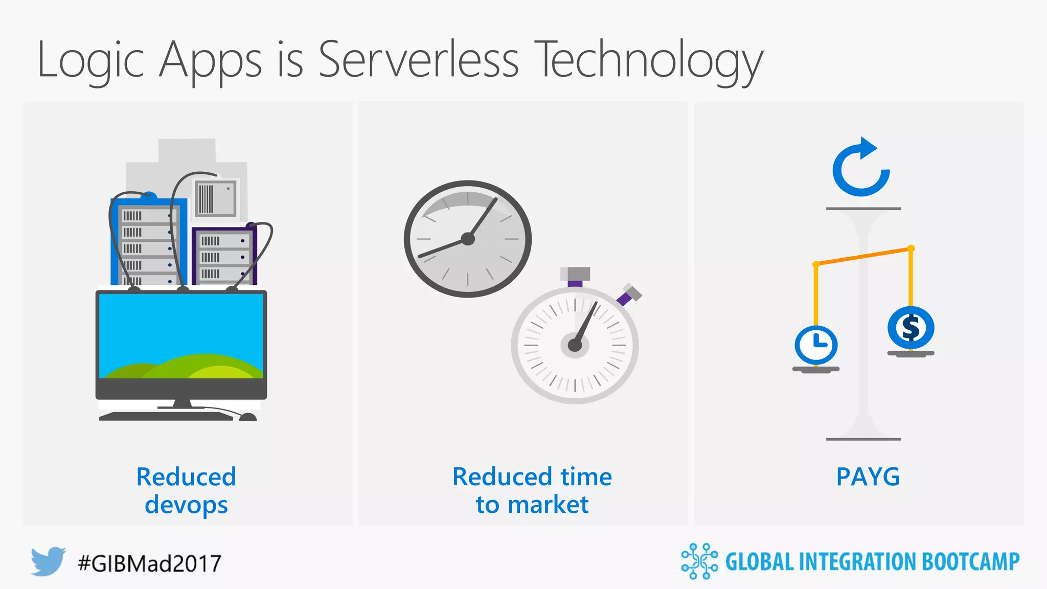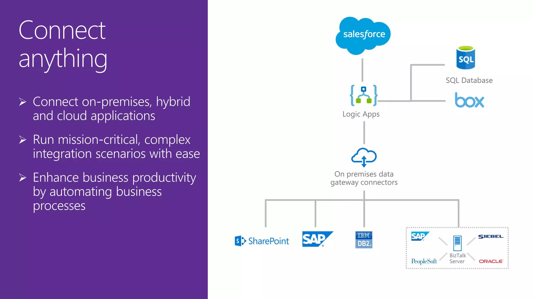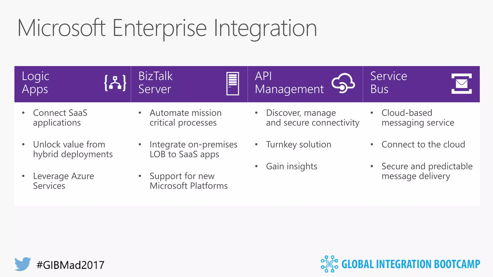 This document discusses Microsoft's Logic Apps product for enterprise integration. Logic Apps allows users to create workflows in the cloud to connect disparate applications without code using a designer. It provides templates, connections to cloud APIs and platforms, and supports protocols and formats like XML and EDI. The presenter takes questions on Logic Apps, API Management, the Enterprise Integration Pack, and BizTalk Server 2016.