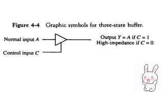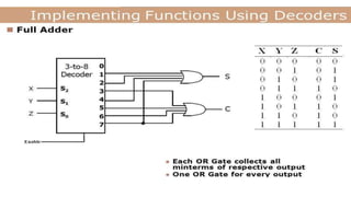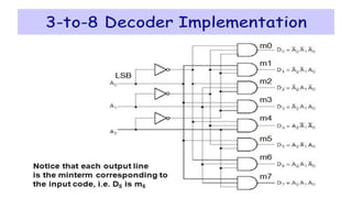 This document covers decoders, multiplexers, and three-state gates. It defines decoders as having multiple input lines and fewer output lines, with m=2^n outputs. Multiplexers are circuits that select one of several data inputs and direct it to a single output, with 2^M select lines for M inputs. Three-state gates can output high, low, or high impedance states.