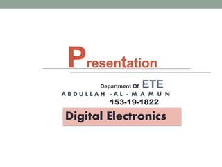 This presentation discusses basic logic gates used in digital electronics. It explains that a logic gate either allows a signal to pass through or stops it, and there are three main types: AND, OR, and NOT. Examples are given for each gate, such as an OR gate triggering a doorbell if either the front or back doorbell switch is pressed, and an AND gate activating a burglar alarm only if both the person sensor and alarm switch are on. A NOT gate inverts the input signal.