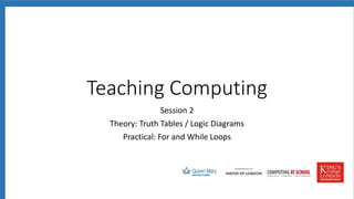 The document discusses logic gates, truth tables, and logic diagrams. It includes examples of logic gates like AND, OR, and NOT. Students are asked to complete truth tables, predict outputs, write logic statements, and draw logic diagrams to represent given scenarios. Practice with logic gates and truth tables is provided through interactive activities.