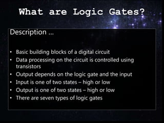 This document provides an introduction to logic gates, which are the basic building blocks of digital circuits. It describes the three basic types of logic gates - AND, OR, and NOT - and explains their functions and truth tables. Specifically, it states that logic gates use transistors to control data processing in a circuit based on their input states of high or low, and produce an output that is also either high or low. The document provides examples of combining logic gates, such as using an AND gate with a NOT gate to create a NAND gate.