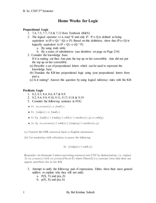 This document contains homework assignments on propositional and predicate logic for a 5th semester B. Sc. CSIT course. It includes: