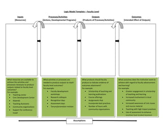 This document provides templates for logic models at the institutional, faculty, and student levels. The templates outline the inputs, processes/activities, outputs, and outcomes for each level. At the institutional level, the template focuses on activities like workshops and committees that produce outputs like publications and recruitment efforts to achieve outcomes such as increased student learning and retention. The faculty-level template addresses faculty development and community engagement activities that result in outputs like scholarly publications and assignments to achieve outcomes like the use of high-impact teaching practices. Finally, the student-level template discusses programmatic activities and their outputs, which can inform short-term, intermediate, and long-term student outcomes.