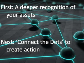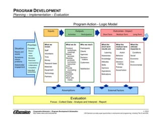 The document explains the concept of logic models, illustrating their role in program evaluation by visually representing the relationship between program activities and intended outcomes. It discusses the benefits of using logic models for planning, communication, and consensus-building while also acknowledging their limitations, such as not capturing actual outcomes or the complexities of human relationships. Additionally, it highlights the importance of an asset-based community development approach, encouraging residents to identify and utilize their strengths for effective community engagement.