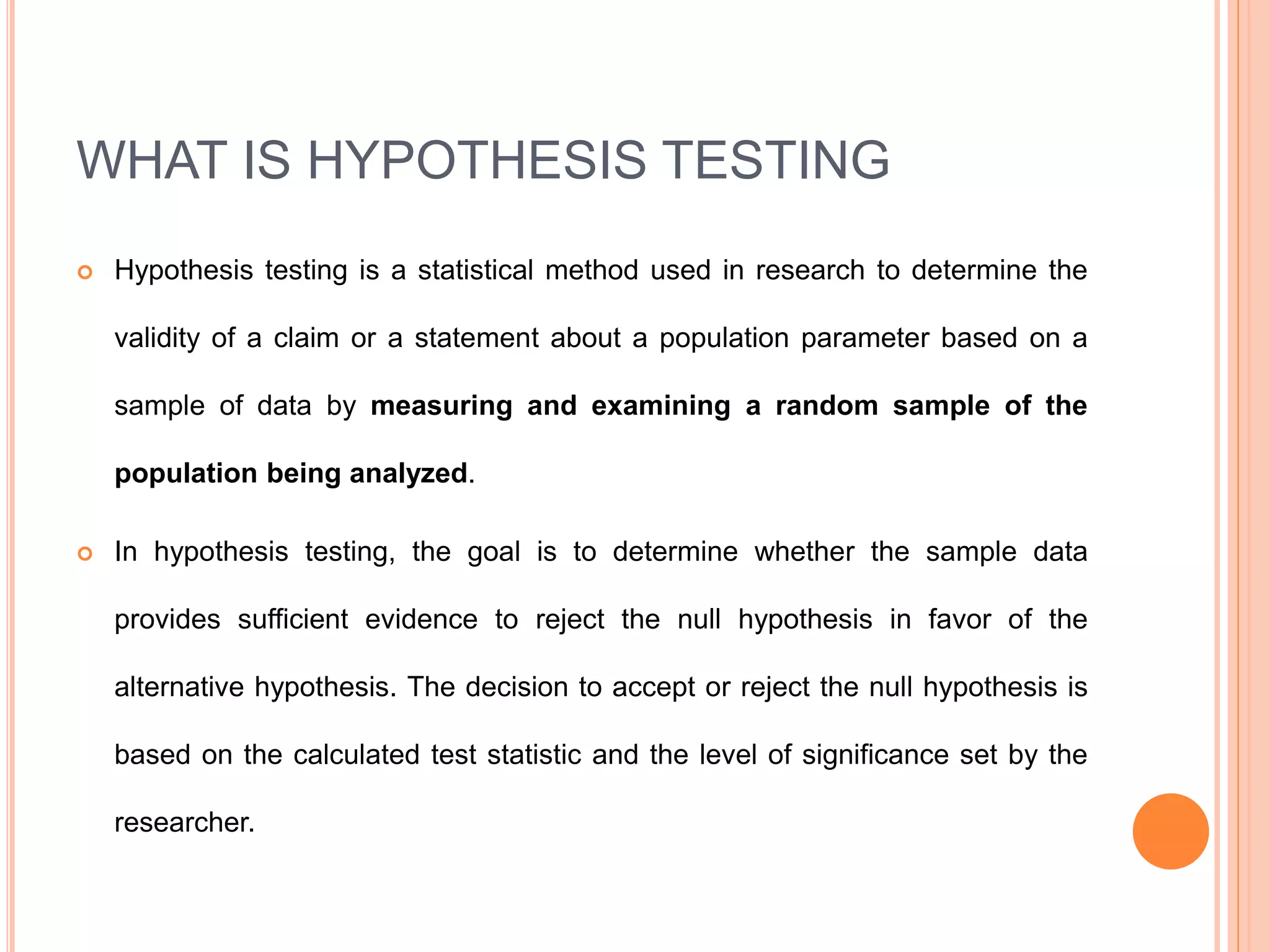 Hypothesis testing is a statistical method used to determine the validity of a claim regarding a population parameter based on sample data. The process involves formulating null and alternative hypotheses, determining the level of significance, choosing a test statistic, and making a decision based on the comparison of the test statistic with the critical value. The outcome indicates whether there's sufficient evidence to reject the null hypothesis in favor of the alternative hypothesis.