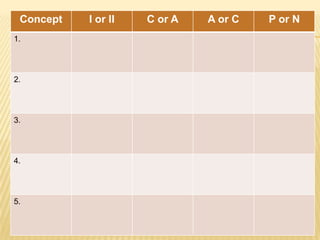 Kinds of concept4.Positive Concepts: signifies the existence or possession of something Ex. happyNegative Concepts: signifies the absence of something Ex. sad