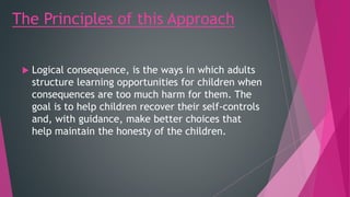 The logical consequence model is an approach used by adults to structure learning opportunities for children involving consequences that do not cause harm. It aims to help children regain self-control and make better choices with guidance. Key aspects of the model include consequences being respectful, relevant to the action, and realistic to follow through. Benefits include consequences directly relating to behaviors, children understanding why, and learning responsibility and good decision making.