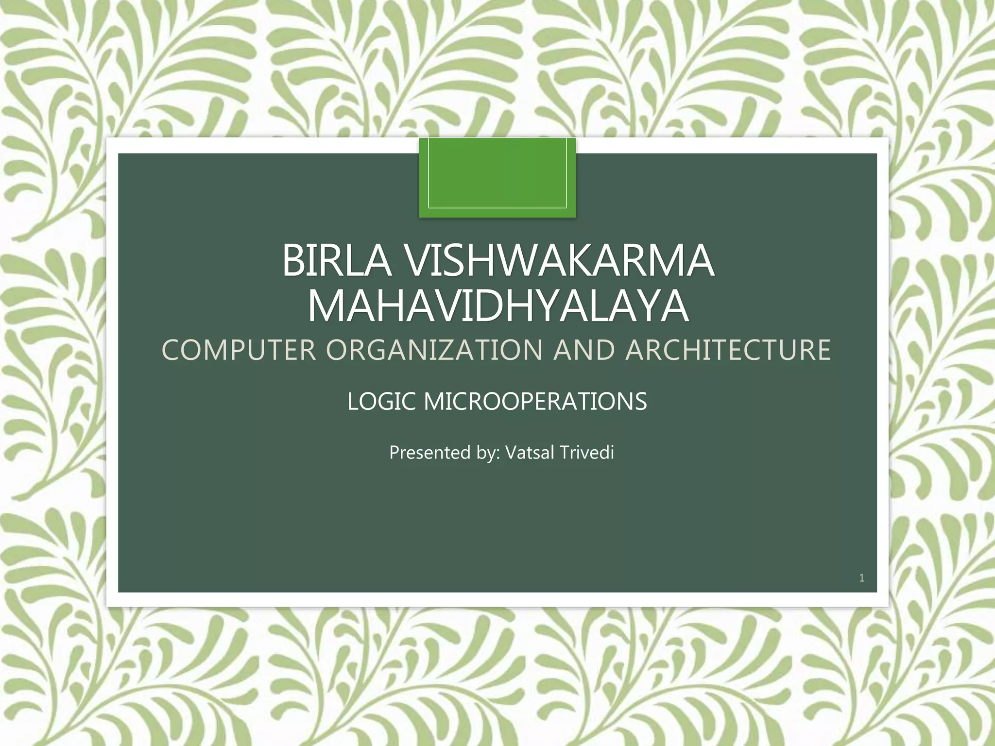 The document provides an overview of logic microoperations in computer organization and architecture, detailing special symbols, the list of operations, and hardware implementation. It explains various logic functions and their representations, such as AND, OR, XOR, and their uses for manipulating individual bits in registers. Additionally, it discusses applications like selective set, complement, clear, mask operations, and insert operations for managing data within registers.