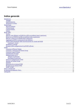 Il documento tratta LVM (Logical Volume Manager) versione 2, evidenziando i suoi vantaggi nell'implementazione di storage flessibile e sicuro per sistemi GNU/Linux. Viene esplorata la gestione dei volumi fisici, gruppi di volumi e volumi logici, insieme a procedure per la creazione, ridimensionamento e gestione dei RAID con LVM. Infine, fornisce strumenti di verifica e comandi utili per gestire e monitorare le configurazioni di RAID e LVM.