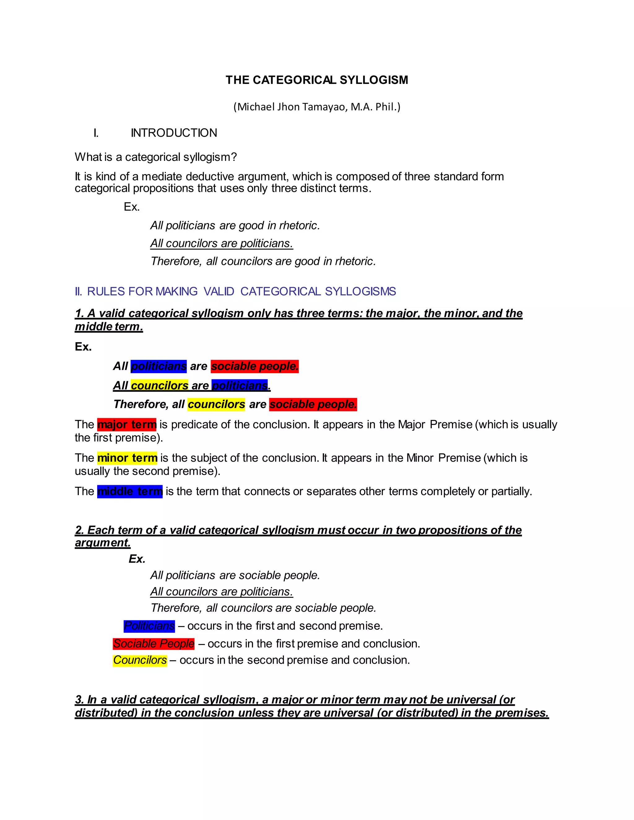 This document discusses the categorical syllogism, which is a deductive argument composed of three categorical propositions using only three distinct terms. It provides examples and outlines 8 rules for making valid categorical syllogisms, including that they must have only 3 terms, each term must occur in two propositions, and the conclusion's terms must be distributed as in the premises. It also describes the 4 figures of categorical syllogisms based on the arrangement of terms, and the valid moods for each figure defined by the propositions' quantity and quality.