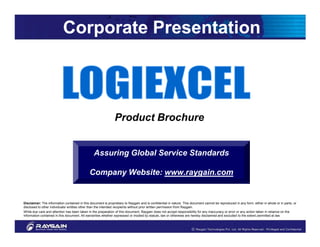 Raygain Technologies, founded in 2006 and ISO 9001:2008 certified, specializes in IT solutions and product development, offering services across various domains including enterprise automation, healthcare, and e-governance. Their flagship product, LogiExcel, provides real-time tracking for logistics and includes customizable modules for sales, transport, and billing. The company emphasizes confidentiality and disclaims any liability for inaccuracies, ensuring a robust technological infrastructure for its clients.