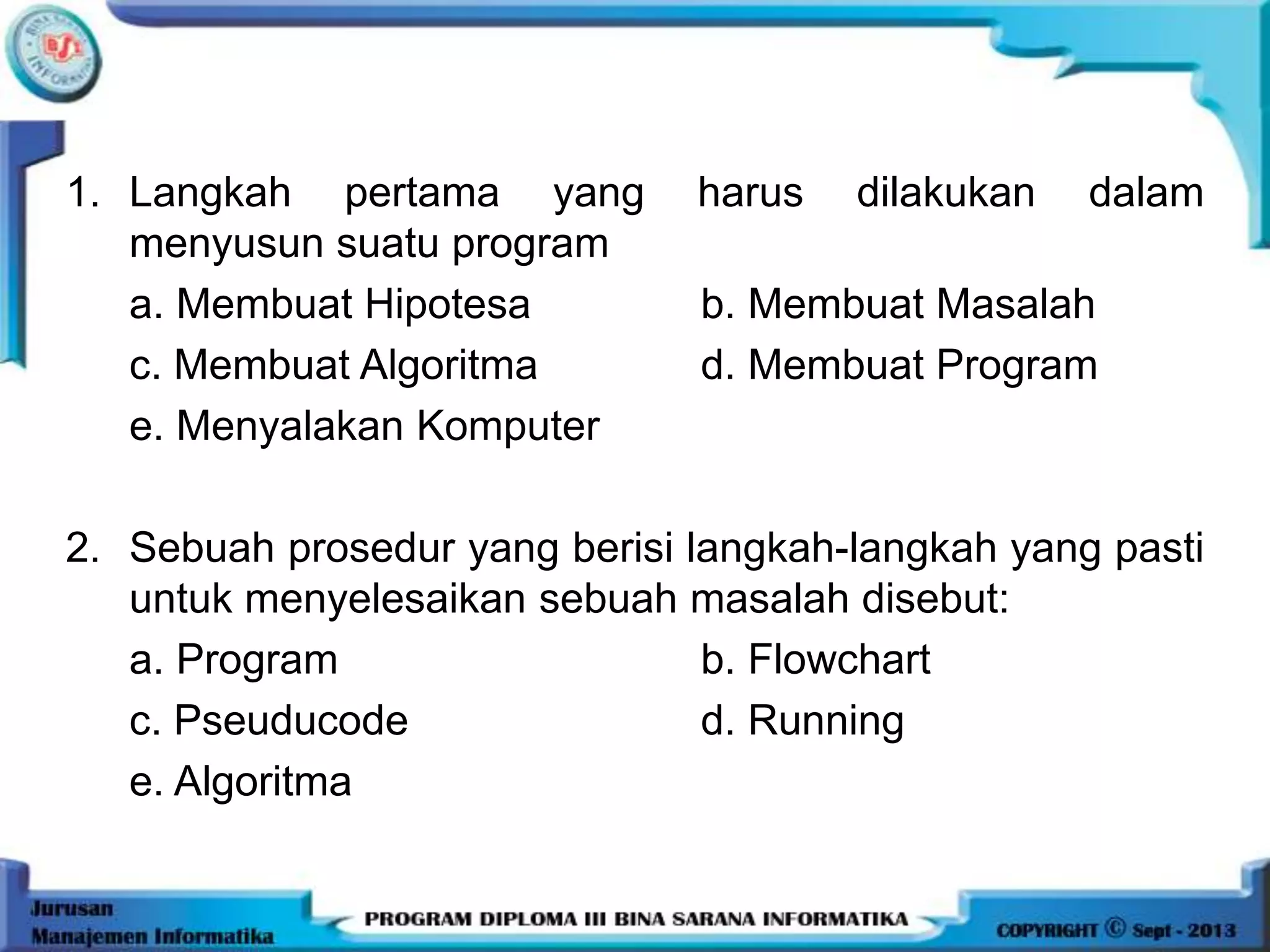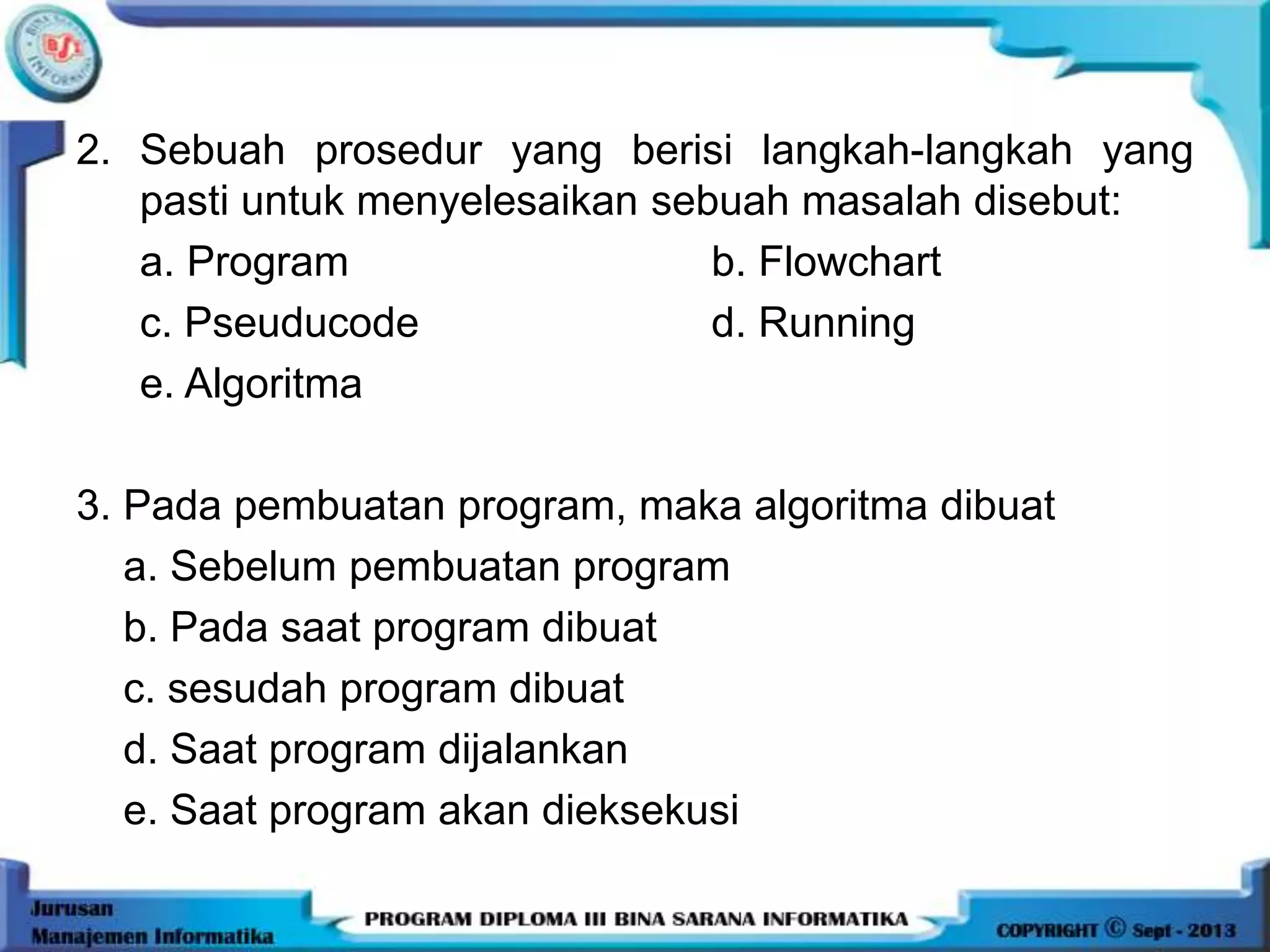3. Pada pembuatanprogram, maka algoritma dibuat