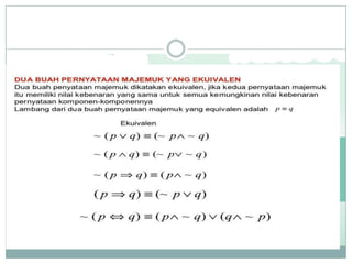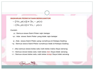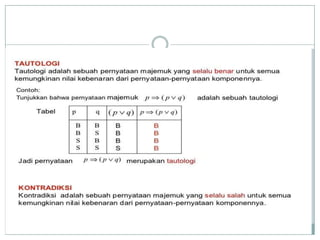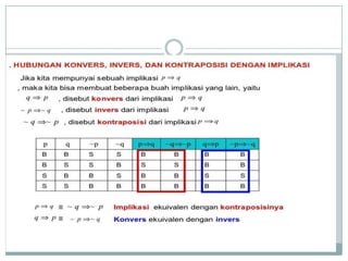 Dokumen ini membahas konsep logika proposisional, termasuk nilai kebenaran, kontradiksi, kontingensi, dan ekuivalensi pernyataan majemuk. Terdapat contoh penerapan biimplikasi dan sifat-sifat logika seperti komutatif, asosiatif, dan distributif. Selain itu, dokumen juga mencakup latihan untuk menentukan nilai kebenaran serta invers, konvers, dan kontraposisi dari berbagai pernyataan.