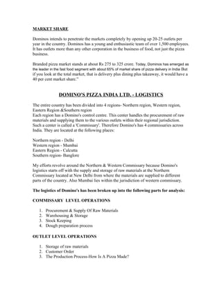 Domino's Pizza India Ltd was established in 1995 as the master franchisee for Domino's Pizza in India and neighboring countries. It opened its first store in New Delhi in 1996 and has since expanded to over 125 stores across 30 cities, making it the largest pizza delivery chain in South Asia. Domino's maintains a network of regional commissaries that procure, process, and distribute raw materials to stores. The commissary system and optimized procurement strategy have enabled Domino's to achieve economies of scale and become the dominant player in the Indian pizza delivery market with over 65% share.