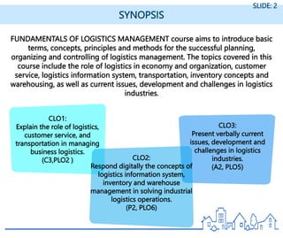 Chapter 3 of the logistics management course focuses on transportation, including its cost, pricing, logistics and traffic management, and factors affecting logistics decisions. It explains the concepts of time and place utility in transportation, the roles of inbound and outbound logistics, and the importance of carrier-shipper contracts and alliances. The chapter concludes by addressing decision processes for mode selection, routing, scheduling, and the use of technology in improving transportation efficiency.