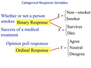 This document provides an overview of logistic regression for categorical response variables. It begins with examples of binary, ordinal, and nominal categorical variables. It then demonstrates how logistic regression models the log-odds of an event rather than the mean, as linear regression does. The key aspects of binary logistic regression models are described, including the logit form and probability form of the model. Examples are provided using R to model gender based on height, the success of golf putts based on length, and the effectiveness of a medical treatment compared to placebo. Key outputs from logistic regression in R like coefficients, odds ratios, and model comparison are also summarized.