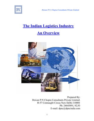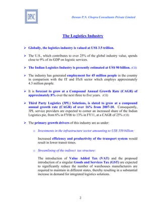 The document provides an overview of the Indian logistics industry. It states that the industry is currently valued at $90 billion USD and is forecast to grow at 8% annually over the next 3-5 years. Third party logistics is expected to grow at over 16% annually. The primary drivers of growth are large investments in infrastructure, reforms to the tax structure like GST, and increasing domestic and international trade. The industry employs over 45 million people in India.