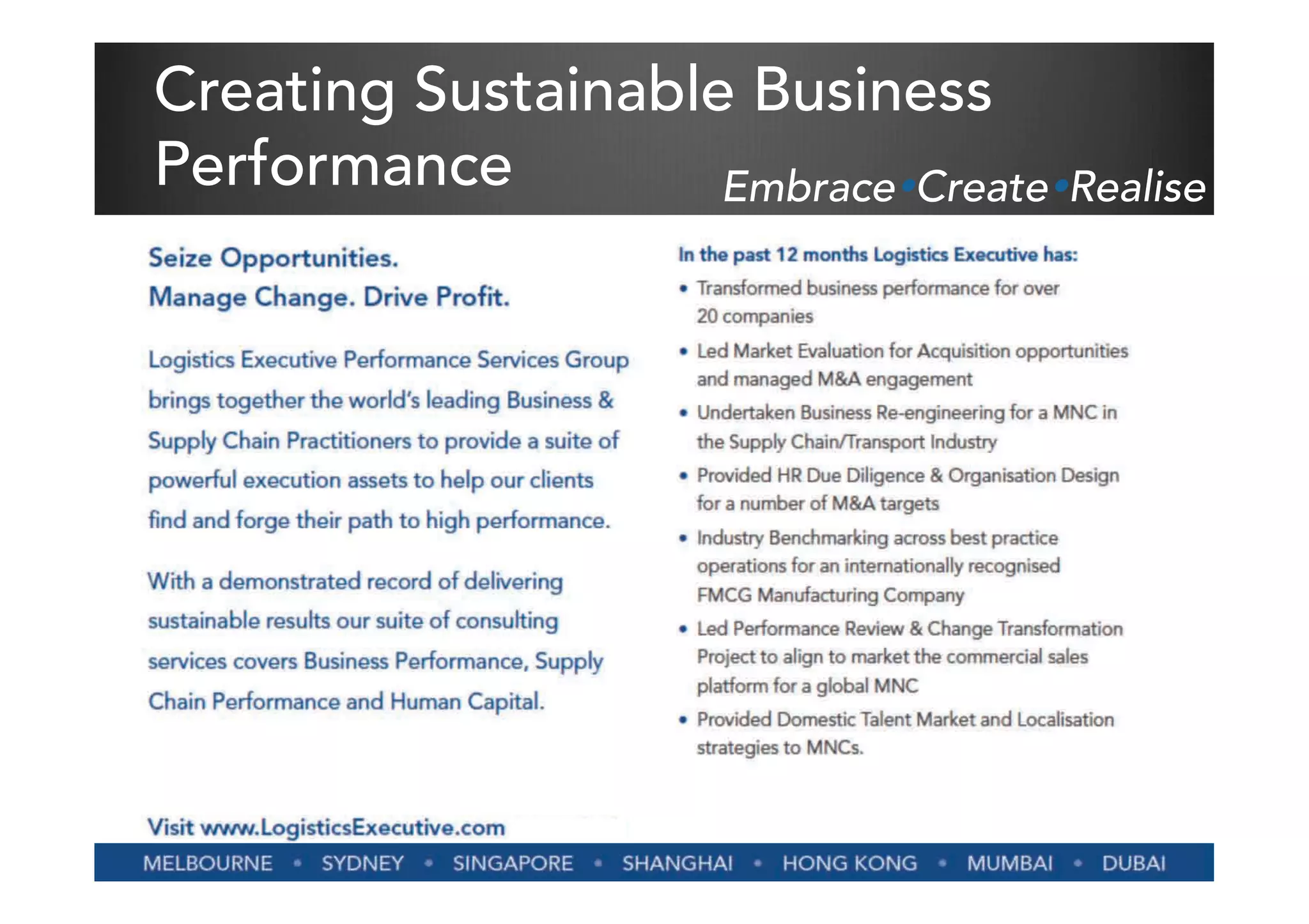 The document outlines a consultancy focused on creating sustainable business performance through various services, including business performance consulting, supply chain optimization, and human capital performance. It highlights the expertise of its leaders in transforming enterprises and driving performance across different sectors. The firm emphasizes collaboration with clients and leveraging a global network of business experts to achieve competitive advantages.