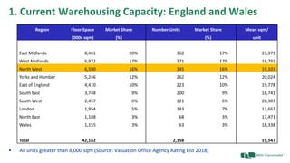 The document summarizes the current state and future trends of logistics warehousing in the North West of England. It finds that the majority of large warehouse space is concentrated near major population centers and transportation infrastructure like motorways. However, rail-connected warehouse space in the North West lags other regions like the Midlands. The document predicts growing demand for more sustainable rail freight transport due to issues like congestion and air quality. This will require developing more rail-served warehouses and cross-dock facilities to reduce road mileage. The North West region needs to identify and plan additional strategic rail-served sites to capitalize on future growth opportunities in rail freight.