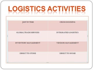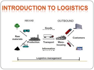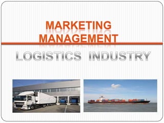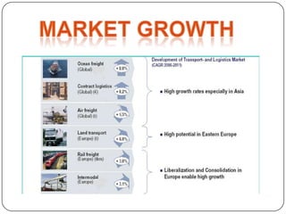 The document summarizes key information about the logistics industry globally and in India. It states that the global logistics industry size is over $3500 billion, with the US market being $1100 billion and India between $130-150 billion. It also notes that logistics costs typically represent 9-18% of GDP for most countries. Specifically, logistics costs are 14% of GDP for India and 18% of GDP for China. The top industries that rely on logistics are manufacturing, retail, and FMCG. Major players and new technological trends in the industry like RFID and reverse logistics are discussed. Challenges and opportunities for growth in the Indian market are also highlighted.