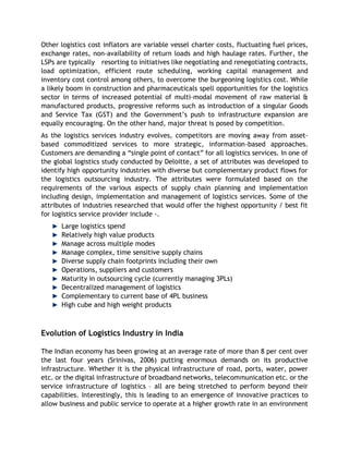 The document provides an overview of the global and Indian logistics industries. It discusses key challenges facing the logistics industry such as high costs, infrastructure bottlenecks, shortage of talent, and demand for new technology. While the global logistics industry is estimated to be worth $300 billion, the Indian industry still has immense growth potential but faces issues like low demand, poor infrastructure, and high costs. The document also analyzes opportunities and trends in the Indian logistics industry such as the need for improved infrastructure, adoption of new technologies, skills development, and industry consolidation through mergers and partnerships.