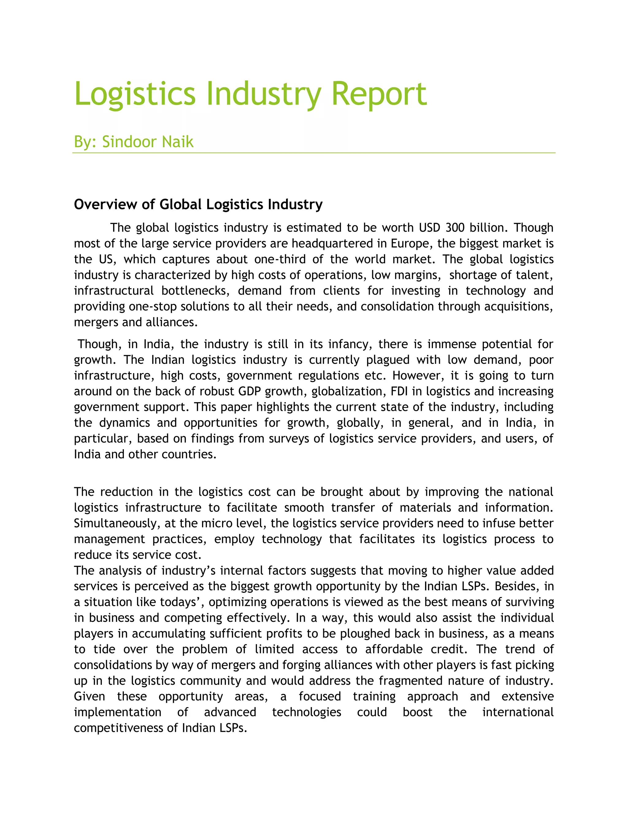 The document provides an overview of the global and Indian logistics industries. It discusses key challenges facing the logistics industry such as high costs, infrastructure bottlenecks, shortage of talent, and demand for new technology. While the global logistics industry is estimated to be worth $300 billion, the Indian industry still has immense growth potential but faces issues like low demand, poor infrastructure, and high costs. The document also analyzes opportunities and trends in the Indian logistics industry such as the need for improved infrastructure, adoption of new technologies, skills development, and industry consolidation through mergers and partnerships.