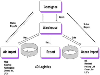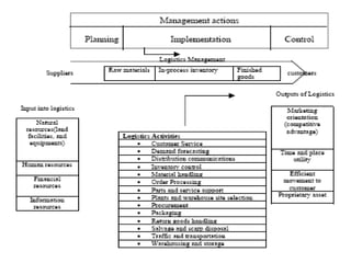 This document provides an overview of logistics management. It defines logistics as managing the flow of materials and finished goods from suppliers to customers. This includes transportation, warehousing, inventory management, and information systems. The objectives of an effective logistics system are to ensure the right goods are delivered to customers in the correct quantities, locations, times and at the lowest overall cost while meeting quality standards. Key aspects of logistics discussed include distribution and warehousing management, physical distribution, and reducing supply chain costs.