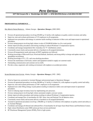 Pete Ortega has over 15 years of experience in warehouse and operations management. He is seeking a management position where he can utilize his experience in areas such as warehouse management, logistics, inventory control, safety procedures, and staff supervision. He has held management roles overseeing large warehouse facilities for companies such as Saddle Creek, Kauffman Tire Distribution, Del Monte Fresh Produce, and Sears.