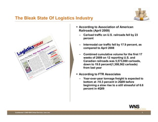 The document discusses the challenges faced by logistics companies amidst economic uncertainty and highlights business process outsourcing (BPO) as a viable strategy to achieve significant cost reduction, with potential savings of 40-50%. It outlines key processes suitable for outsourcing, rules for successful implementation, and provides case studies demonstrating successful cost and efficiency improvements through BPO. The analysis emphasizes the transformation from fixed to variable costs and the need for logistical firms to adopt BPO to remain competitive and improve service delivery.