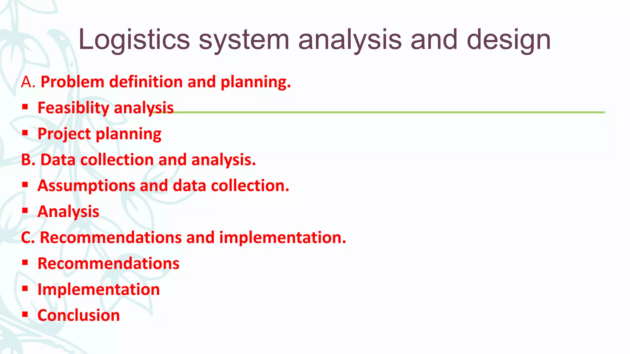 This document outlines the process for analyzing and designing a logistics system. It involves defining the problem through feasibility analysis and project planning, collecting and analyzing relevant data, developing recommendations based on that analysis, and implementing the recommended solution. The key steps are assessing the current system, setting objectives and constraints, analyzing alternatives, identifying the best options based on costs and benefits, developing an implementation plan, and executing that plan while monitoring results. The overall goal is to understand problems with the existing system and design and implement optimized solutions.
