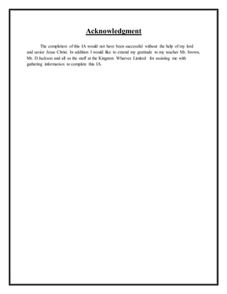 This document provides a summary of Joshua Brown's internal assessment project on logistics and supply chain management for the Caribbean Advance Proficiency Examination. It includes an introduction outlining the project goals, a profile of the local Kingston Wharves port, a review of its operational systems, a comparative analysis with the developed port of Singapore, an assessment of the problem of ship sludge disposal at Kingston Wharves, a plan of action to address this problem, and a recommendation. The key issues identified are inadequate ship waste disposal systems at Kingston Wharves leading to marine pollution, and the recommendation is for Kingston Wharves to invest in MARPOL waste collector vessels to provide efficient ship sludge disposal services.