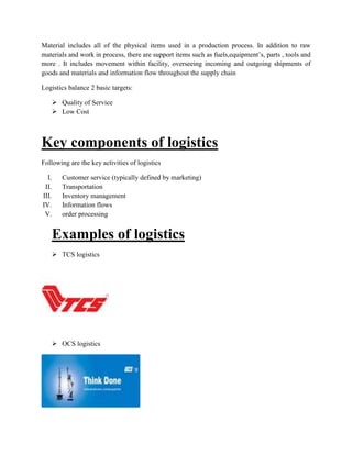Logistics refers to the planning, implementation, and control of efficient movement and storage of goods, services and information from origin to consumption. TCS Courier is a leading logistics provider that offers international and domestic delivery services as well as value-added services like warehousing and fleet solutions. Their vision is to be a respected, innovative and profitable knowledge-based logistics enterprise, and their mission is to achieve profitable growth through excellence in their core business and new service areas.