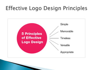 The document provides guidelines for designing an effective logo. It states that a logo must be simple, memorable, timeless, and versatile. It should also be appropriate for its intended purpose. The document then outlines best practices for logo design, such as using preliminary sketches, balancing design elements, employing clever use of color, choosing fonts and styles to suit the company, and keeping the design simple. It emphasizes designing for the client rather than the designer. Overall, the document provides tips for creating a logo that will be easily recognized and represent a company's brand for many years.