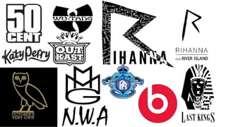 Artists use logos to create brand recognition that builds familiarity with audiences. Logos are popular in hip hop and R&B, with artists like Drake, Kendrick Lamar, and Rihanna known for their emblems, which they promote through album covers, music videos, and merchandise to expand their brands and retail presence. The document discusses choosing a logo design that represents the artist and their message, citing examples like Beyoncé embracing her black heritage or Kendrick Lamar symbolizing ambition.