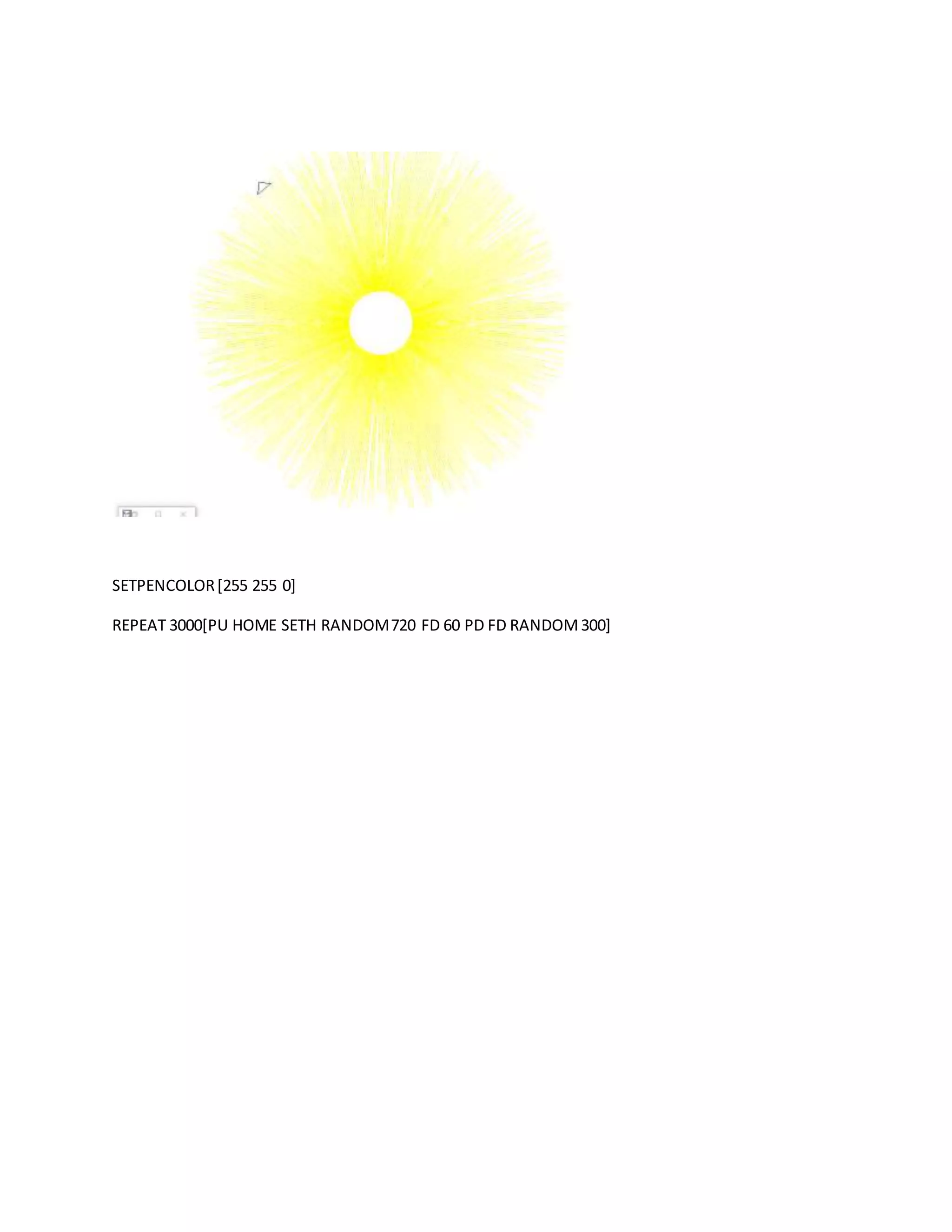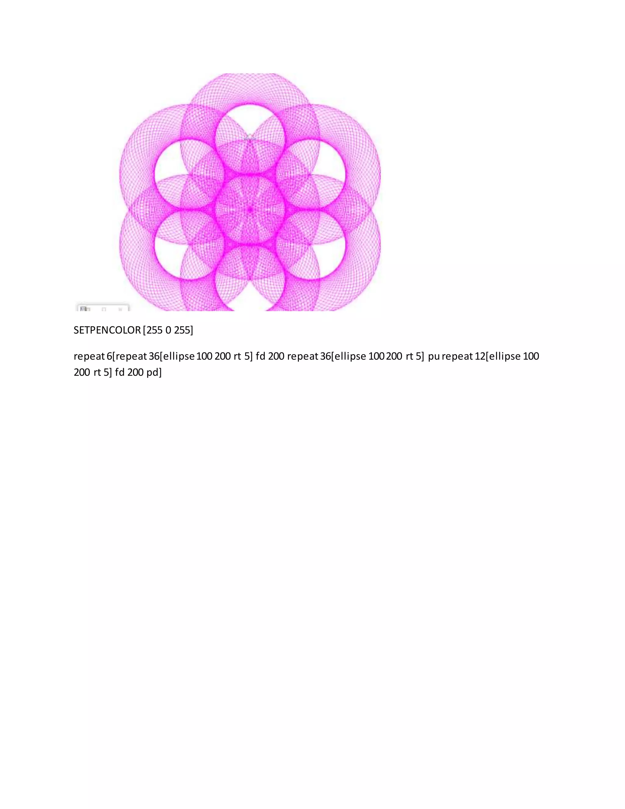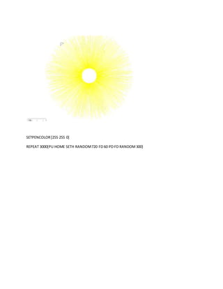 The document contains code to generate several geometric patterns and shapes using Logo programming commands. It repeats circles, ellipses, and random walks using different pen colors and sizes. It also contains code to draw spirals and nested shapes through repetition and changing parameters like pen color, size, and angle of rotation.