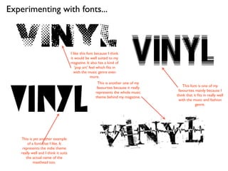 1) The document discusses experimenting with different fonts and backgrounds to design a logo for a music and fashion magazine.