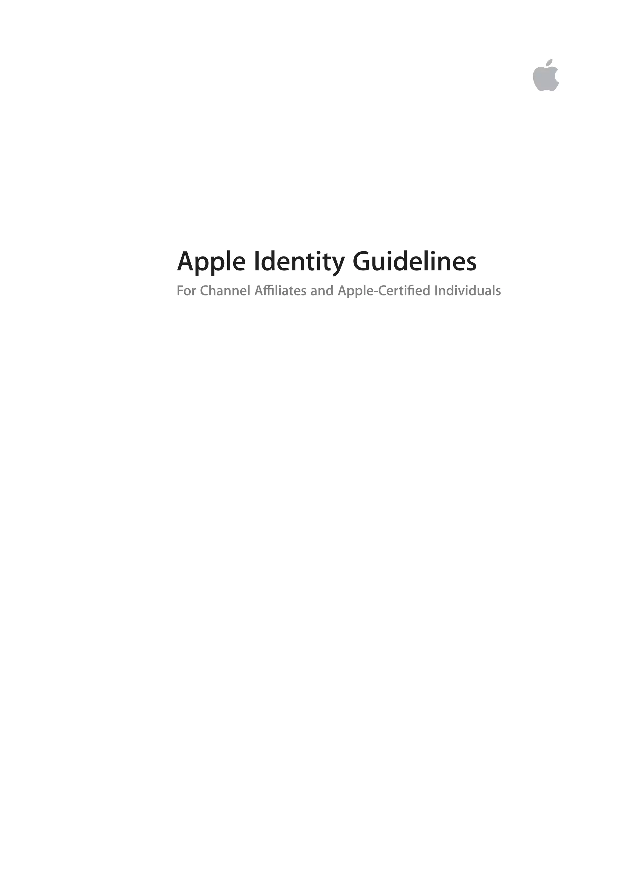 This document provides guidelines for Apple channel affiliates and Apple-certified individuals on properly using Apple's identity, including Apple channel signatures, product photography, and marketing messages. It outlines requirements for displaying Apple logos and signatures on various communications and materials. The guidelines aim to ensure a consistent representation of Apple's brand while allowing affiliates and certified individuals to promote their relationship with Apple.