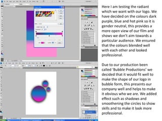 The document discusses the development of a logo for a film production company called Bubble Productions. They chose a color scheme of dark purple, blue, and hot pink to appear gender neutral and appeal to a wide audience. They designed the logo in the shape of bubbles to represent the company name and added shadows and smoothing to make it look professional. Effects like drop shadows and glows were added to the text within the bubbles to make it stand out as the central part of the logo. The completed logo is shown bringing together the design elements cohesively to represent the company and their work.