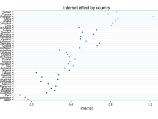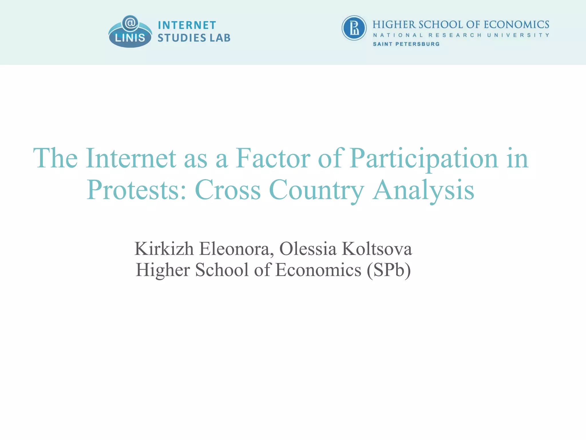 This document summarizes a study that analyzed the relationship between internet use and participation in protests across 40 countries. The study used data from the World Value Survey and multilevel logistic regression modeling. The results found that internet use significantly increases the probability of protest participation by 52% on average. However, the effect varied widely by country, from a slight positive effect to a strong positive effect in some developing countries. The study aims to further analyze how country-level factors like internet penetration and human rights influence the relationship between internet use and protest participation.