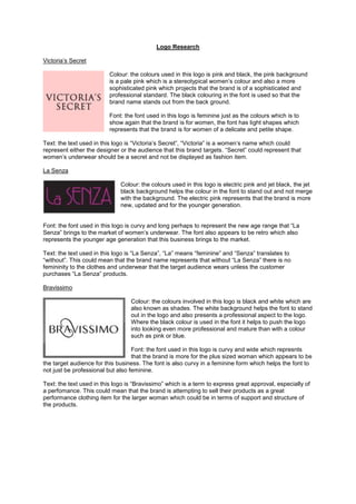The document analyzes and summarizes the logos of three lingerie brands: Victoria's Secret, La Senza, and Bravissimo. For Victoria's Secret, the logo uses pink and black colors and a feminine font to represent sophistication and target women. For La Senza, the logo uses electric pink and black colors with a curvy retro font to target younger women. For Bravissimo, the logo uses black and white shades with a curvy wide font to target plus-sized women in a professional yet feminine way.