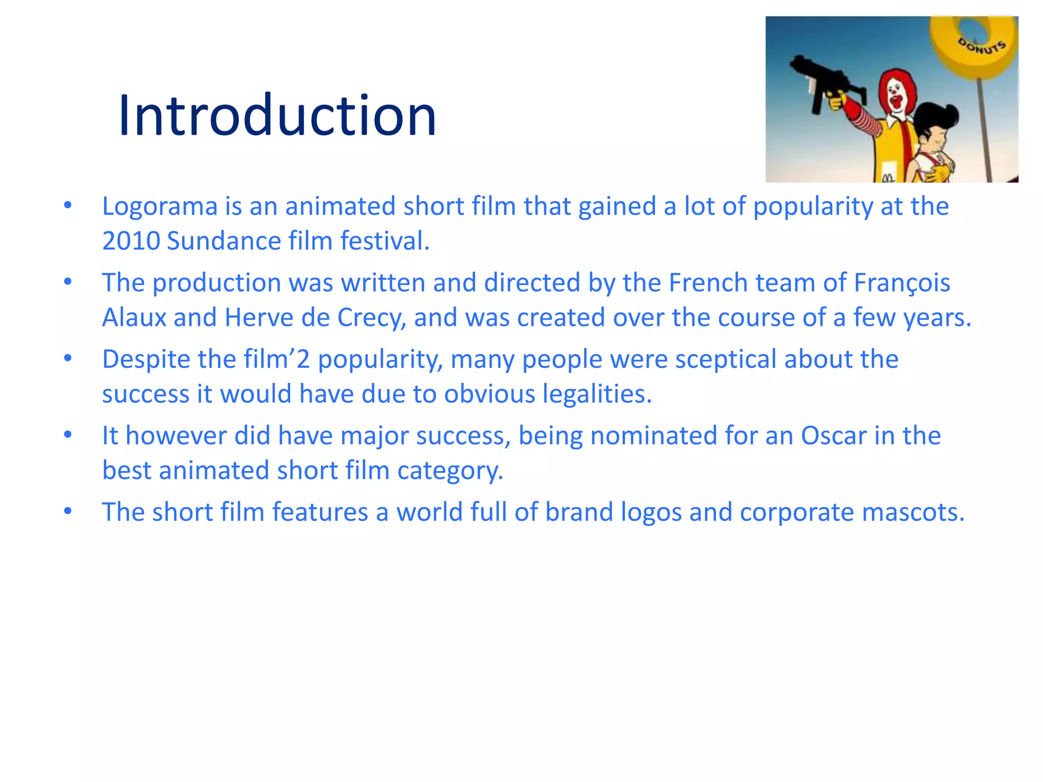 Logorama is an animated short film set in a world entirely comprised of brand logos. It tells the story of Ronald McDonald as a villain being chased by police officer Michelin men. Throughout the film, various logos come to life as characters and iconic brands are represented through their mascots. The film uses this setting to comment on how advertising and corporate brands have come to dominate society.