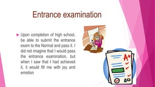 Nataly García Rosales discusses her achievements in teacher training school. She passed the entrance exam, discovered her true vocation for teaching through practice days, and changed her perspective about the challenges of being a teacher. She also made a close friend named Jazmin and overcame personal problems to succeed without giving up.
