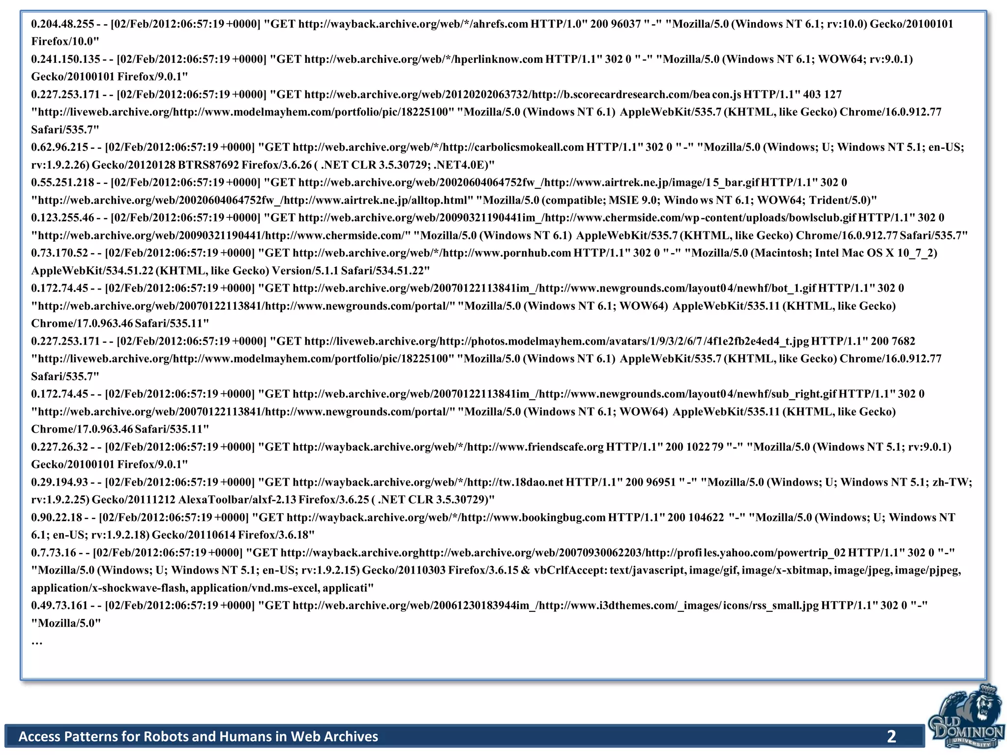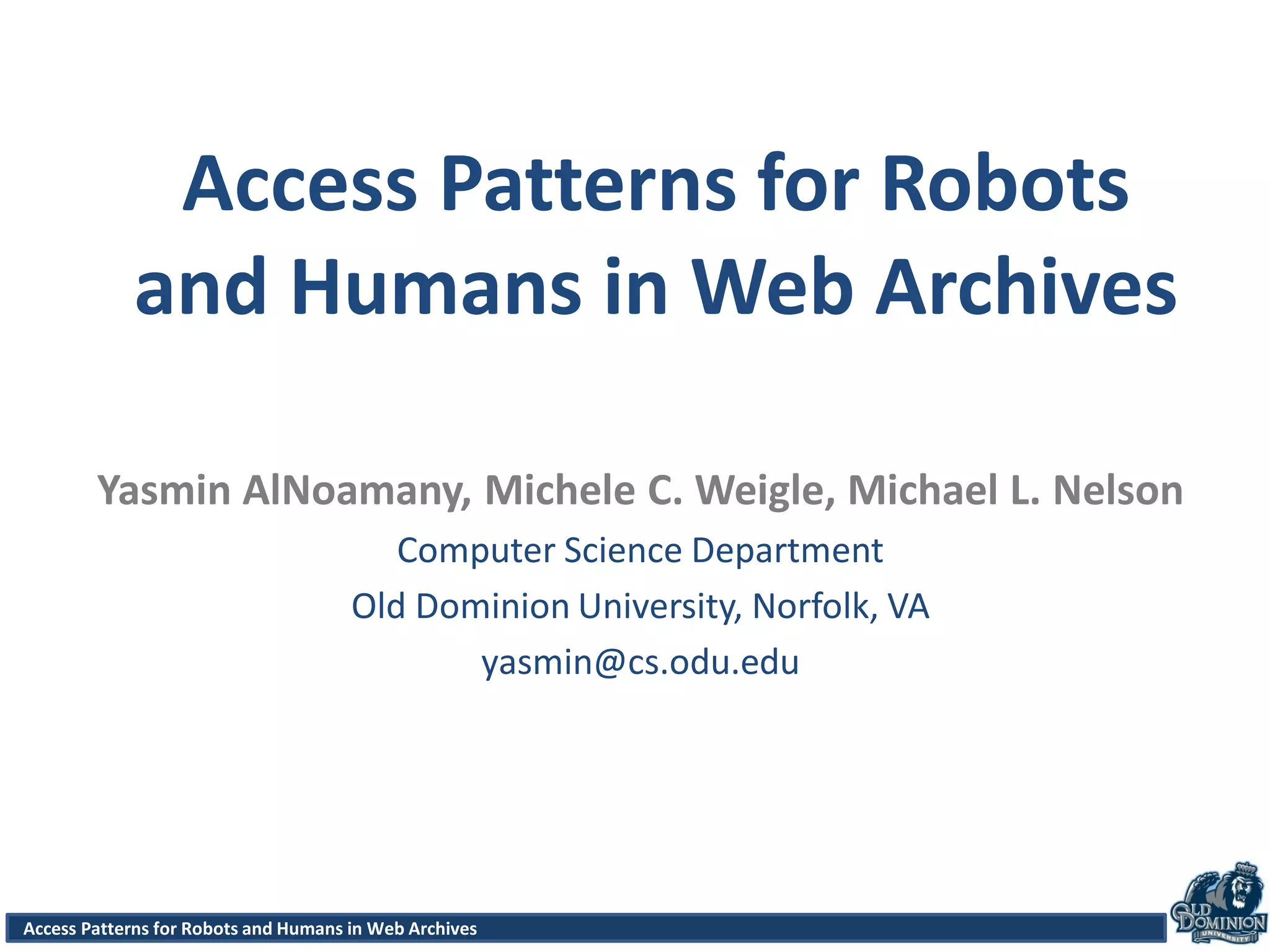 The document discusses a study of access patterns for robots and humans on web archive sites. It aims to analyze web server logs from the Internet Archive to understand how users access archived web pages. The study seeks to determine differences in how humans and robots/crawlers interact with web archives. The methodology section indicates the researchers analyzed sample logs from the Wayback Machine to classify requests and discover patterns.