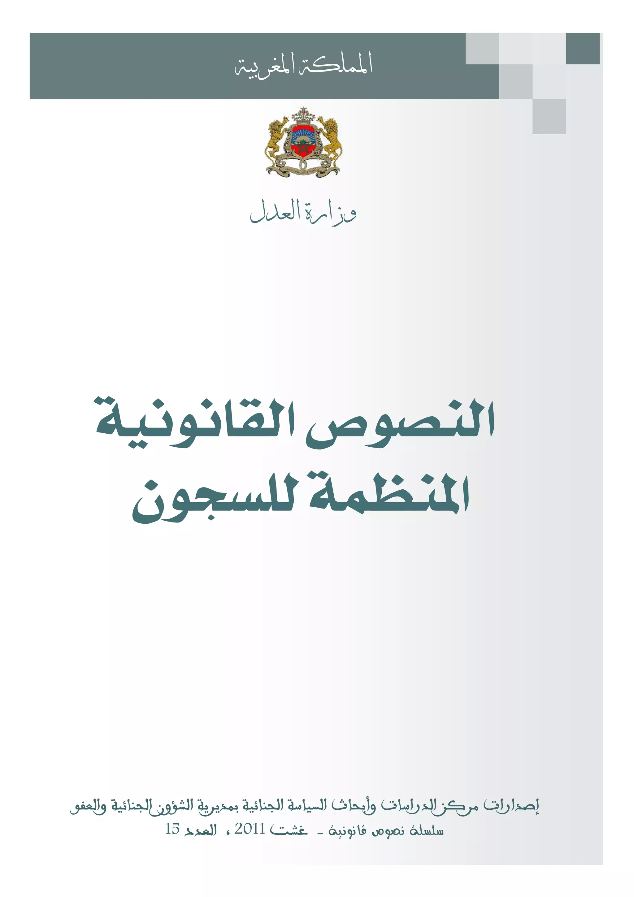 يتناول الوثيقة قانون رقم 89.32 المتعلق بتنظيم وتسيير المؤسسات السجنية في المغرب، والذي يعكس تطور النظام السجني بعد الاستقلال، حيث تم تصنيف السجون إلى أربعة أنواع. القانون يهدف إلى تحقيق التوازن بين الأمن وحقوق النزلاء من خلال تنظيم شامل لظروفهم المعيشية والحقوق القانونية، بما يتماشى مع المعايير الدولية. كما يشمل الوثيقة تفاصيل عن الإدارة السجنية والتشريعات المتعلقة بها، مما يدل على أهمية حقوق الإنسان ومبادئ الإصلاح في النظام القضائي المغربي.