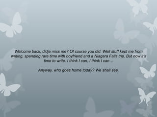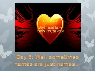 The document discusses the progress of Loki's bachelor challenge, where he had to flirt with the four remaining girls. Aria was eliminated after scoring the lowest. It also discusses characters Valeran and Windaria's plan to recruit Loki to their cause, believing him to be the chosen one, hoping to reach him before he finds love through the bachelor challenge and risks turning to the dark side.