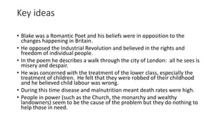 Blake's poem "London" describes the miserable conditions he observed in the city of London during the Industrial Revolution. Through the use of vivid imagery and rhetorical devices, he depicts a place defined by suffering, where poverty, child labor, and disease run rampant. Blake held those in power, like the church and wealthy landowners, responsible for failing to help the lower classes and end their endless cycle of misery. The poem expresses Blake's Romantic and political beliefs opposing the changes brought about by industrialization.